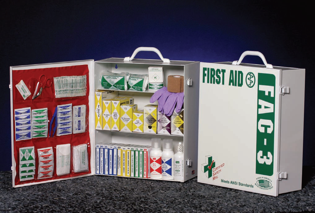 | Heavy duty metal cabinet that is sturdy and dust resistant. Three shelf cabinet wth door pockets. A variety of high quality first-aid products. Meets and exceeds ANSI standard Z308.1-1998 FAC-3 Size: 13.5" x 16" x 5.5" |
