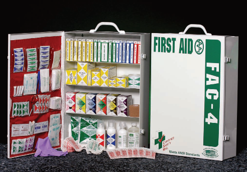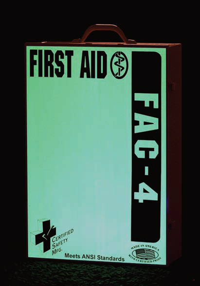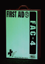 | Heavy duty metal cabinet that is sturdy and dust resistant. Four shelf cabinet with door pockets. A large variety of high-quality first-aid products. Meets and exceeds ANSI standard Z308.1-1998 New - Glow in the Dark FAC-4 Size: 15" x 22" x 51/2" |