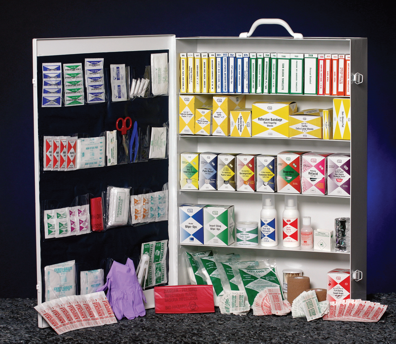 | Heavy duty metal cabinet that is sturdy and dust proof. Five shelf cabinet with door pockets. Extra large variety of high-quality first-aid supplies Meets and exceeds ANSI standard Z308.1-1998 New- Glow in the Dark Kit |